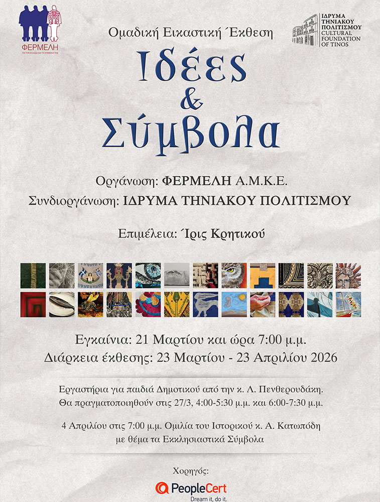 Η Πολιτιστική Εταιρεία ΦΕΡΜΕΛΗ (phermeli.gr), στο πλαίσιο της δράσης της για τη διαφύλαξη και την προβολή της ιστορικής μνήμης και της ελληνικής πολιτισμικής κληρονομιάς, συνεργάζεται με το Ίδρυμα Τηνιακού Πολιτισμού για την παρουσίαση της ομαδικής εικαστικής έκθεσης «Ιδέες & Σύμβολα», η οποία θα φιλοξενηθεί στο Μέγαρο του Ιδρύματος στην Τήνο από τις 23 Μαρτίου έως τις 23 Απριλίου 2026.